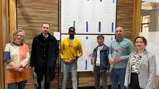 Stadsdichter Alied van der Meer begeleidde de afgelopen weken nieuwkomers en vluchtelingen van de boot en het AZC Schalkhaar in het maken van gedichten rond het 4-mei thema: ‘Leven in oorlog en onvrijheid’. Deze mensen, waarvan sommige aangereikt via Deventer Doet, zijn afkomstig uit Oekraïne, Syrië, Congo, en Turkije en tonen in het gemeentehuis hun werk.