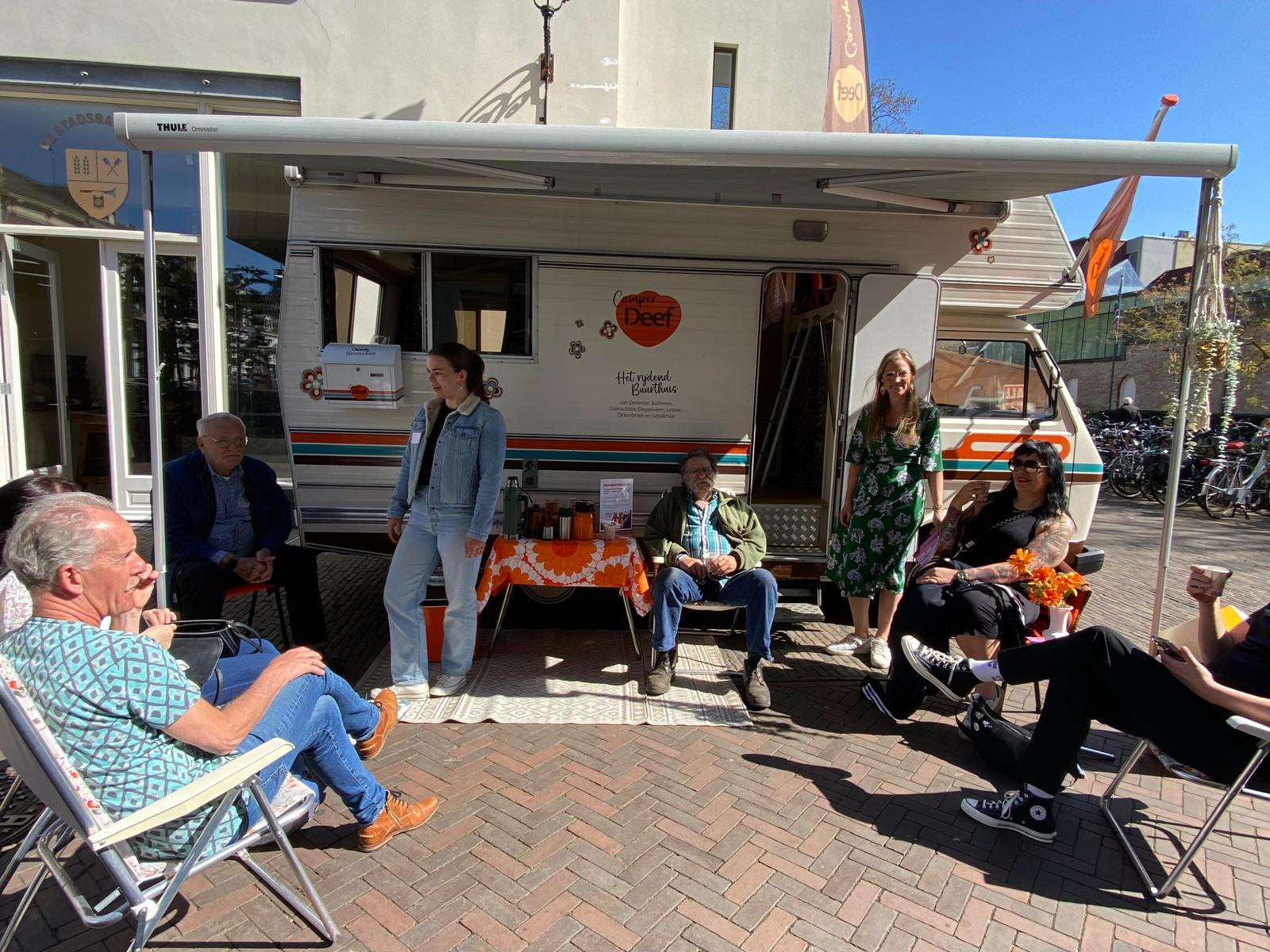 Buiten de Bibliotheek was ook iets bijzonders aan de hand want daar stond Camper Deef; het rijdende buurthuis van Deventer. Deze retro camper (volledig ingericht in jaren 70 stijl!) rijdt normaal gesproken door Deventer en stopt in elke wijk. Mensen kunnen dan langskomen om een kopje koffie of thee te drinken en een gezellig praatje te komen maken. Zo ook vandaag op het Deventer Maatjes Event, in een lekker voorjaarszonnetje. Ook bij Camper Deef staat ontmoeting en verbinding dus centraal.