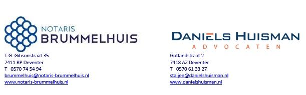 We zijn voornemens om, als de overheidsmaatregelen in het kader van de Covid19-pandemie voorbij zijn en we weer veilig samenkomsten kunnen organiseren, u allen de gelegenheid te bieden ons nader over dit onderwerp (of wat verder ter tafel komt) te bevragen. U ontvangt daarover te zijner tijd nader bericht. Voor nu, Notaris Brummelhuis en Daniels Huisman Advocaten zijn te allen tijde bereikbaar.